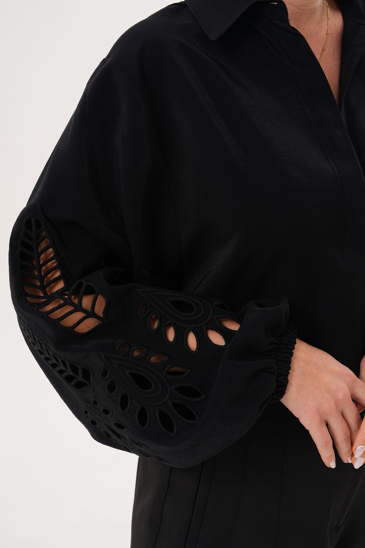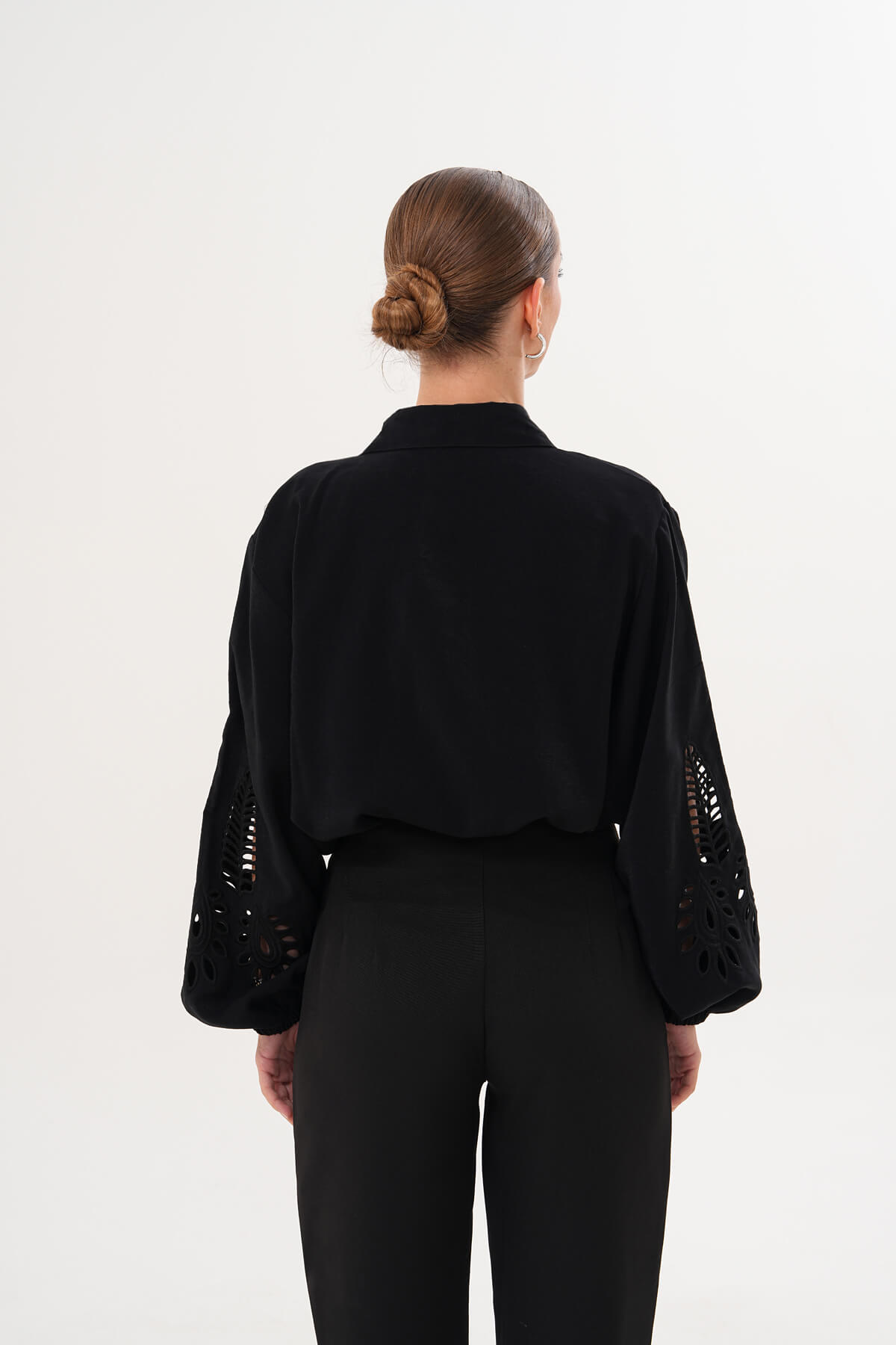 Açıklama: Balon kollu, ön düğmeli kapamalı gömlek. Kol kısmı nakış desenli. Yanlarında kroşe dantel detaylı gömlek. Ön düğme kapamalı tasarım.