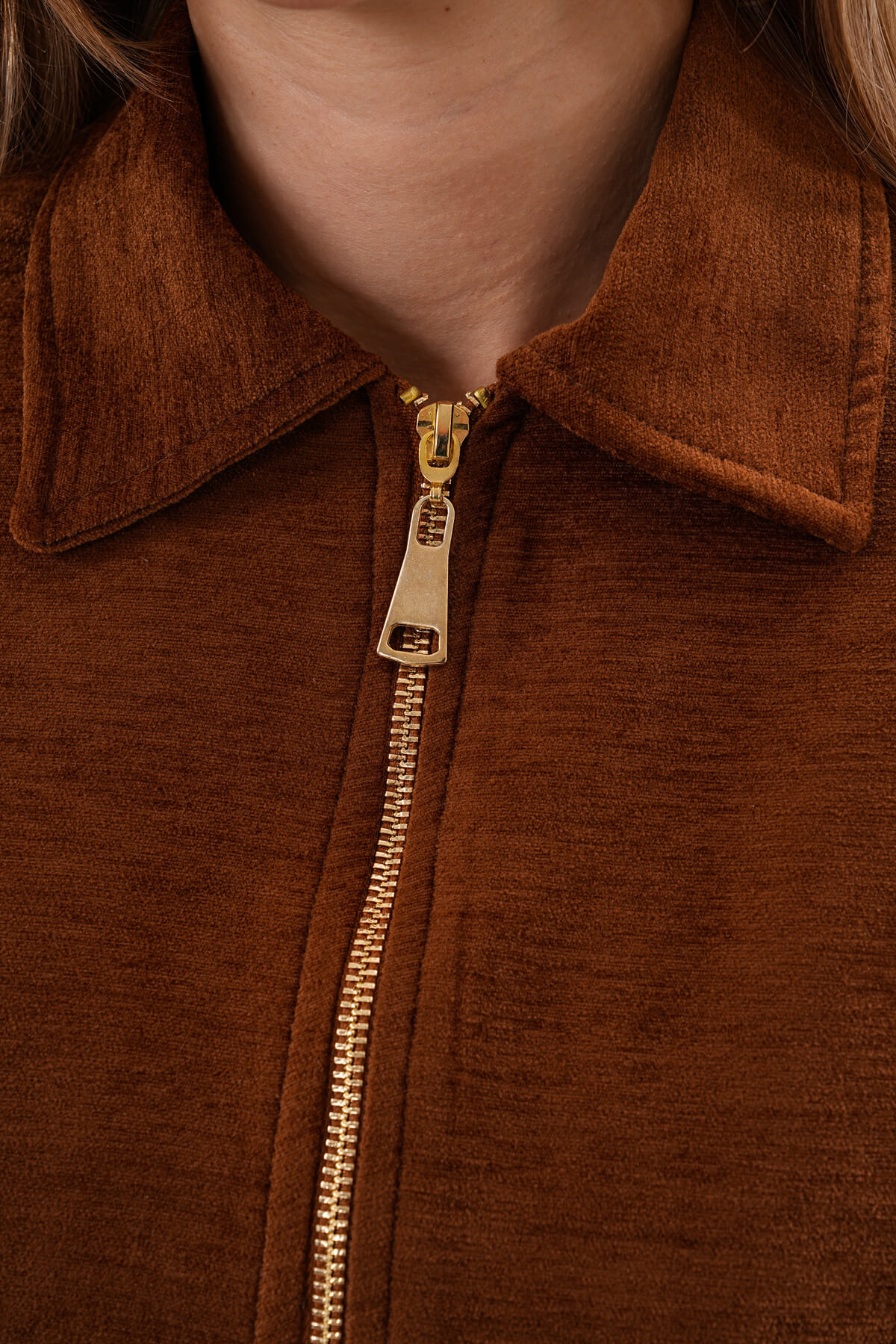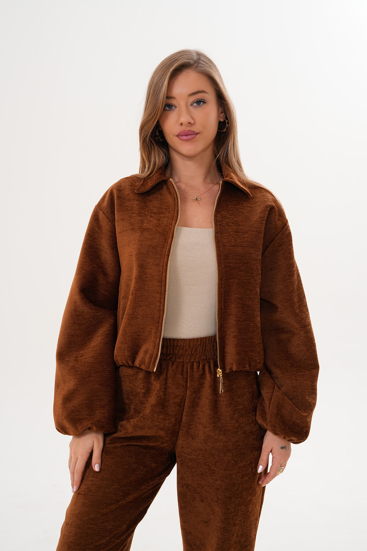 Açıklama: Uzun kollu, yakalı bomber ceket. Önde biyeli cepler. Etek ucu büzgülü ve volümlü. Metal fermuarlı ön kapama.