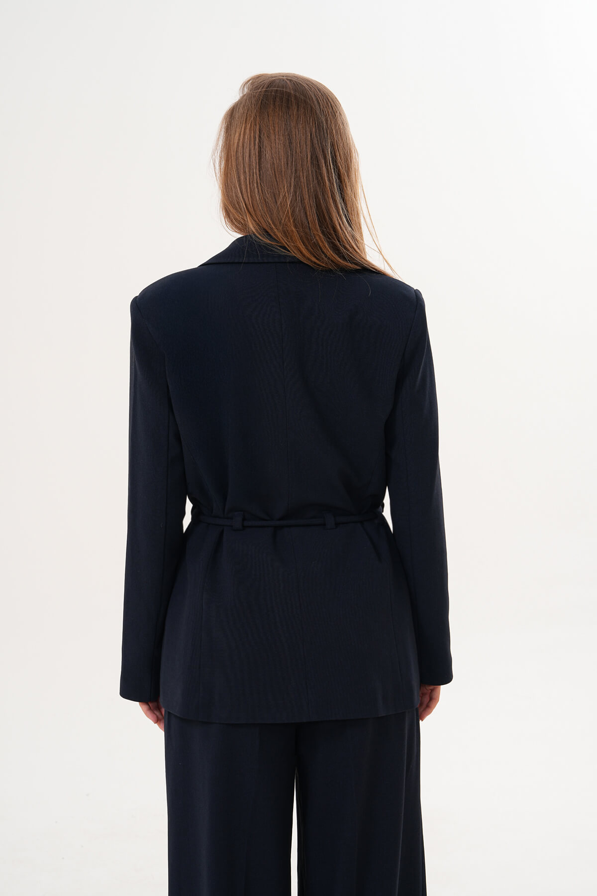 Açıklama: Katlı yakalı, vatkalı omuzlu uzun kollu blazer. Önde yalancı cepler, iç tek düğme kapama ve ip kemer bağlamalı tasarım.