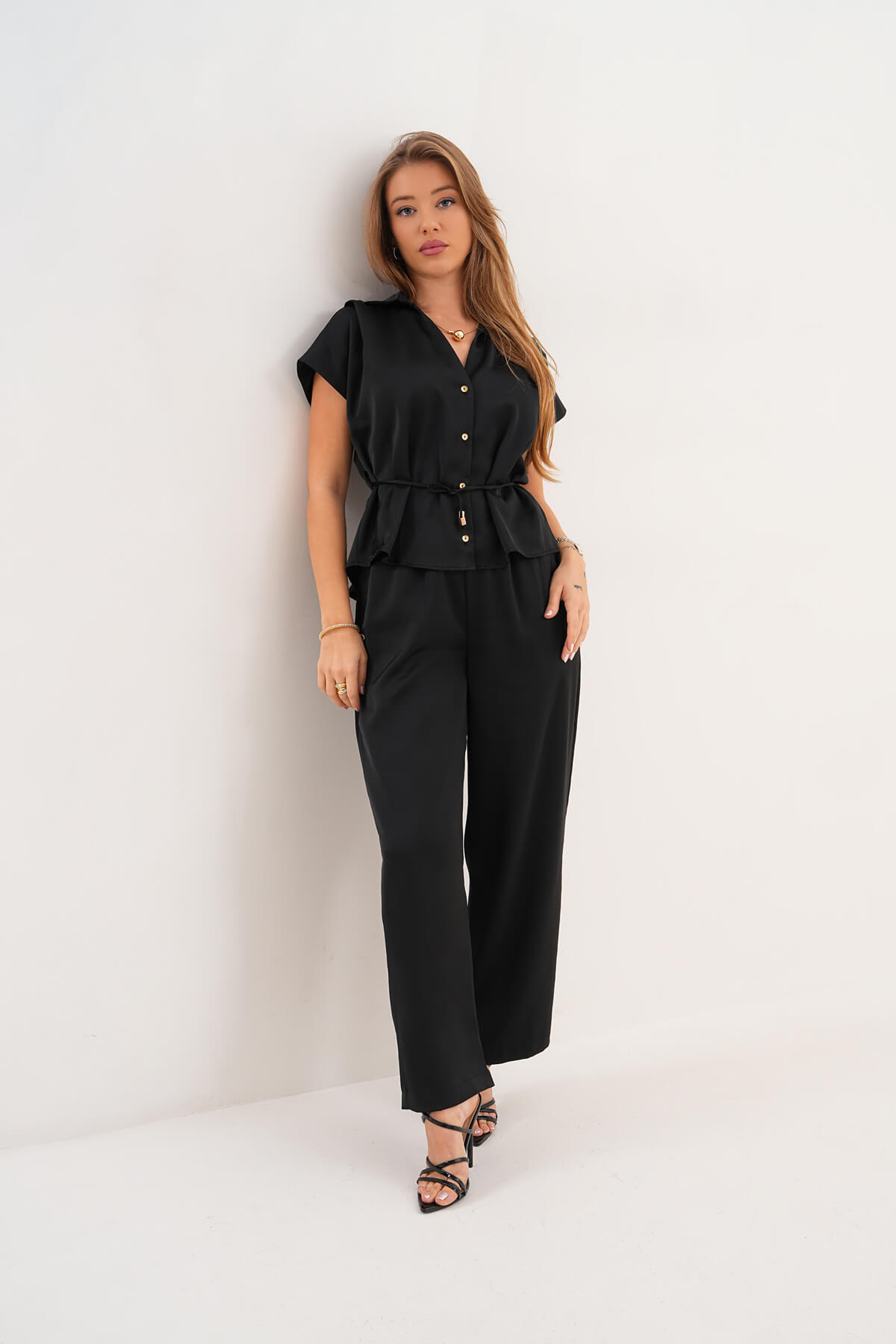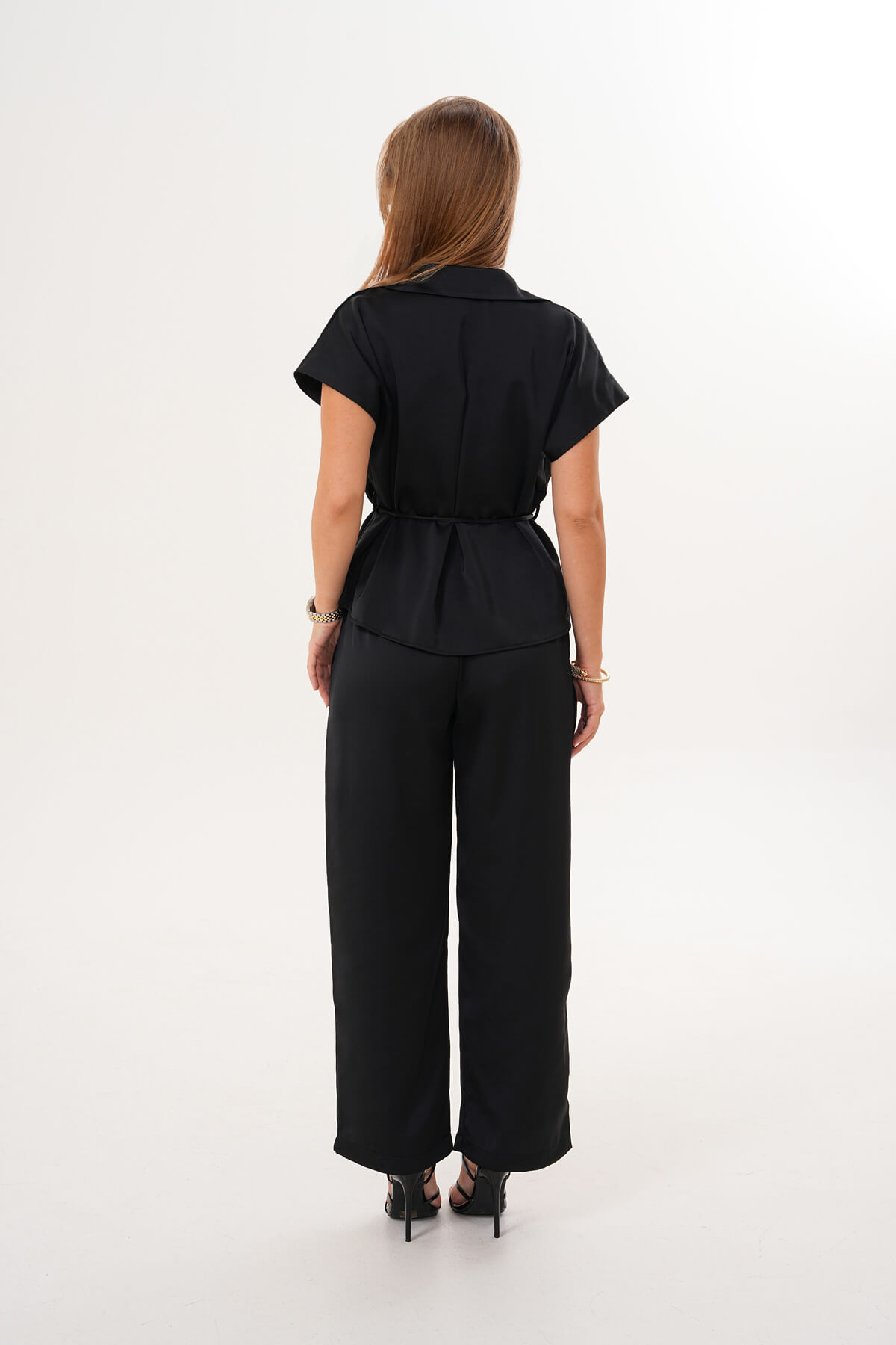 Kısa Kollu İp Kemerli Saten Gömlek MDG-25-D-81 Siyah
