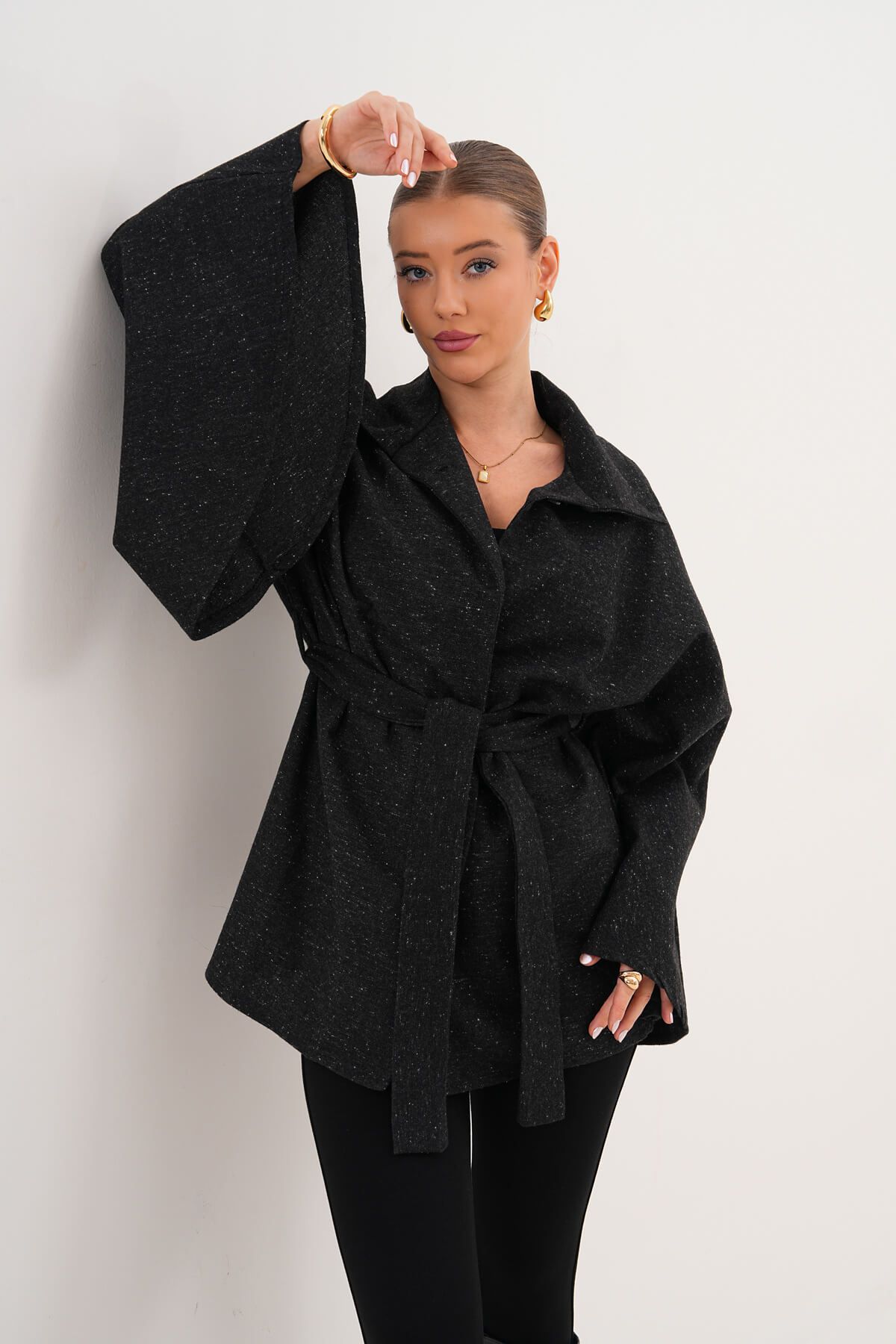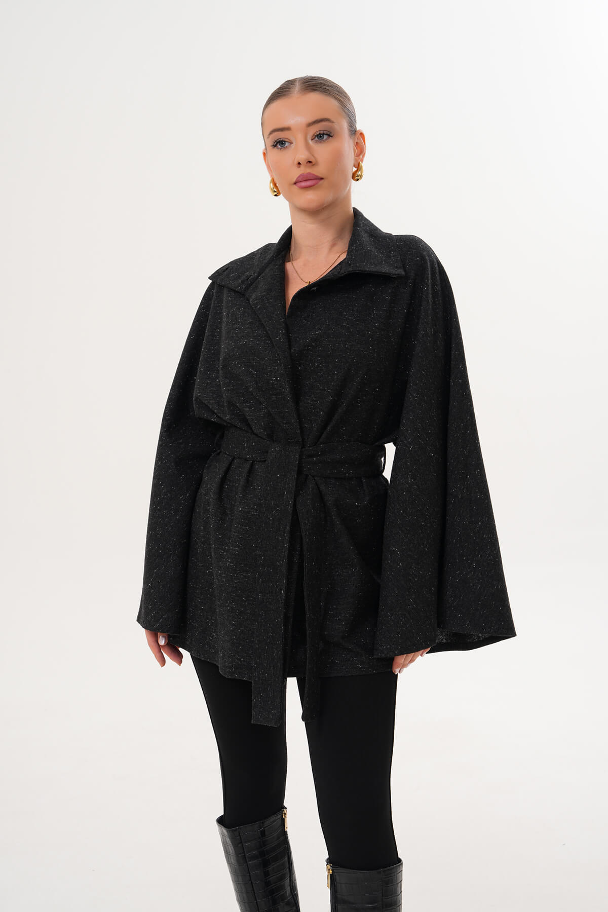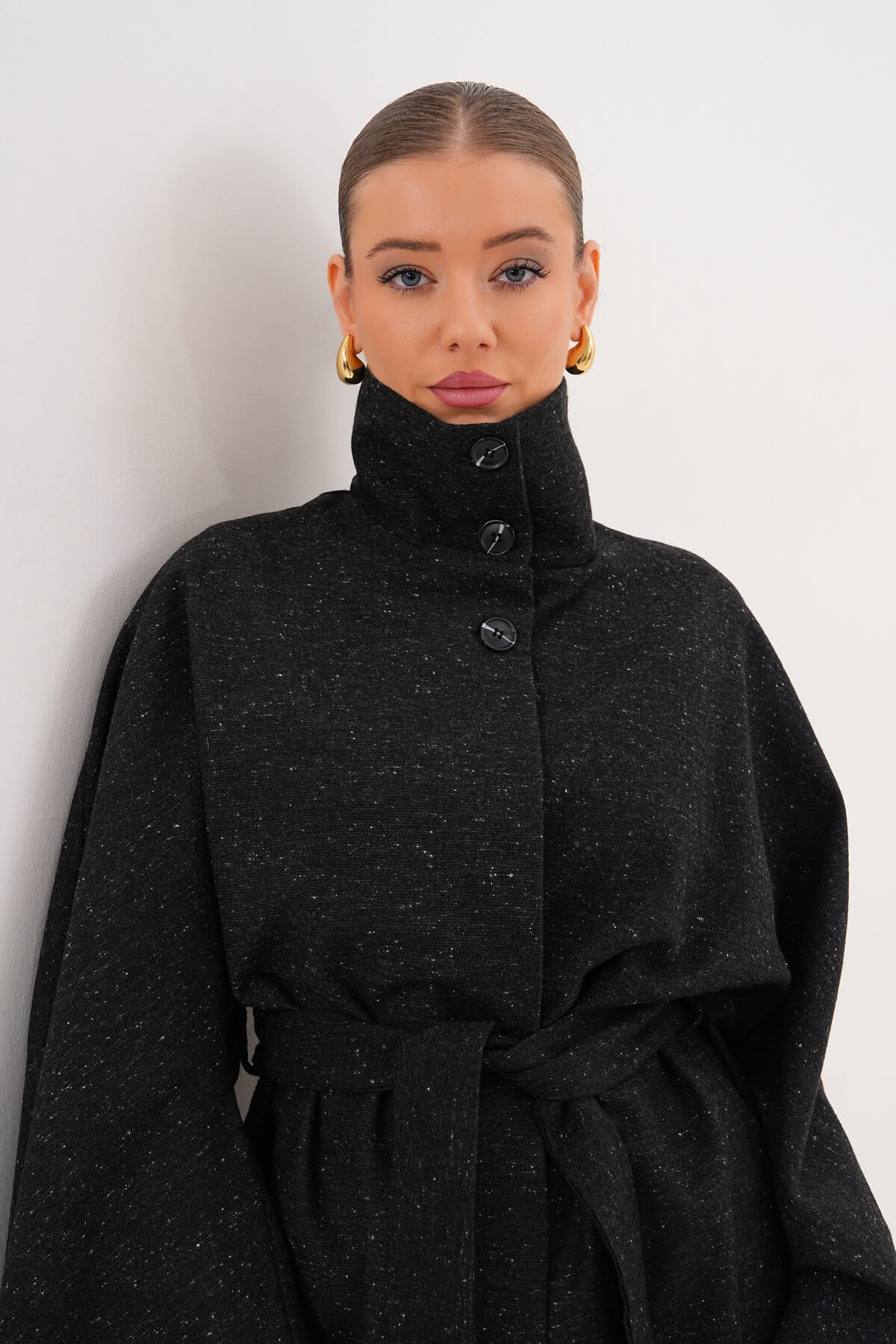 Yaka önü düğme kapamalı, astersiz pelerin. Kemerli model.
