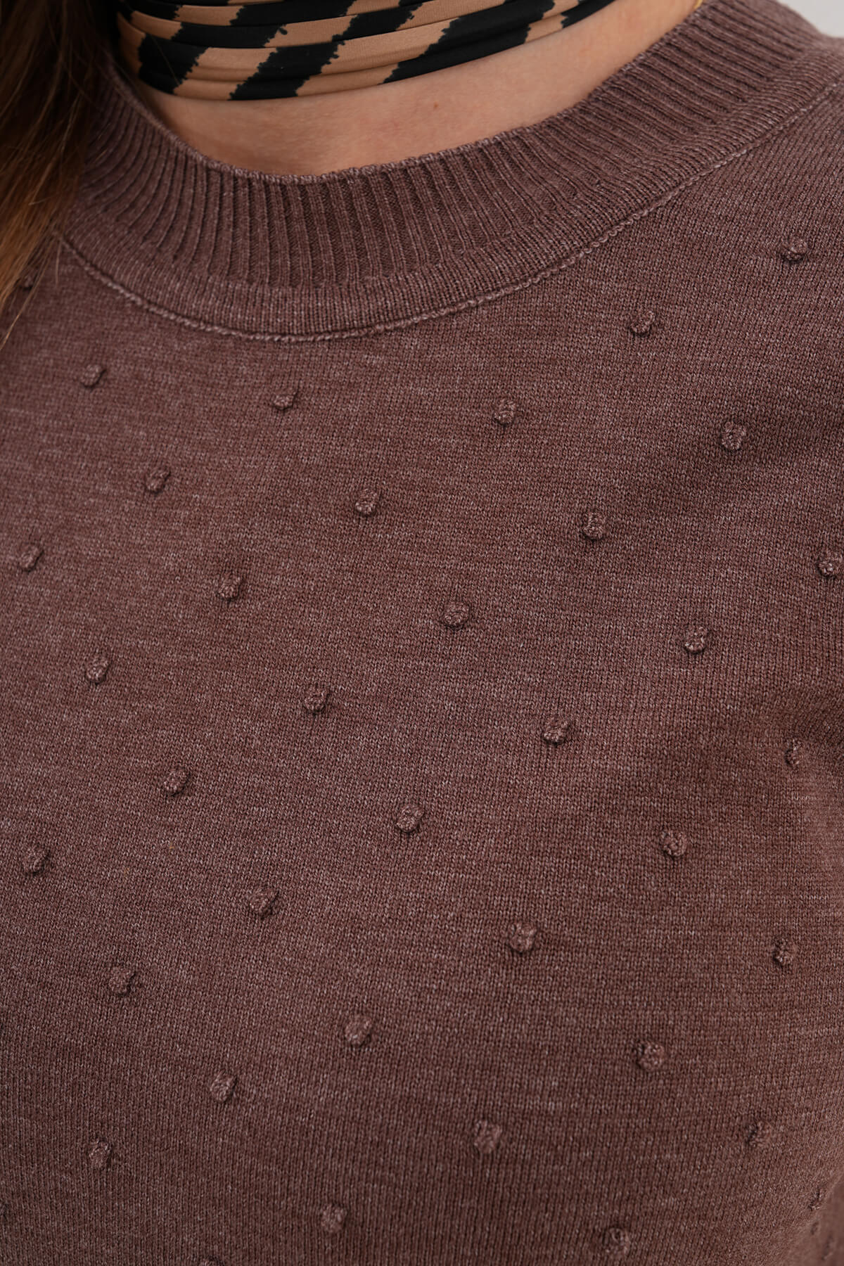 Ponpon Desenli Kısa Kollu Triko Bluz MDG-22744 Kahverengi