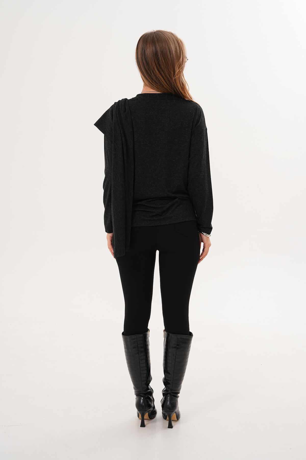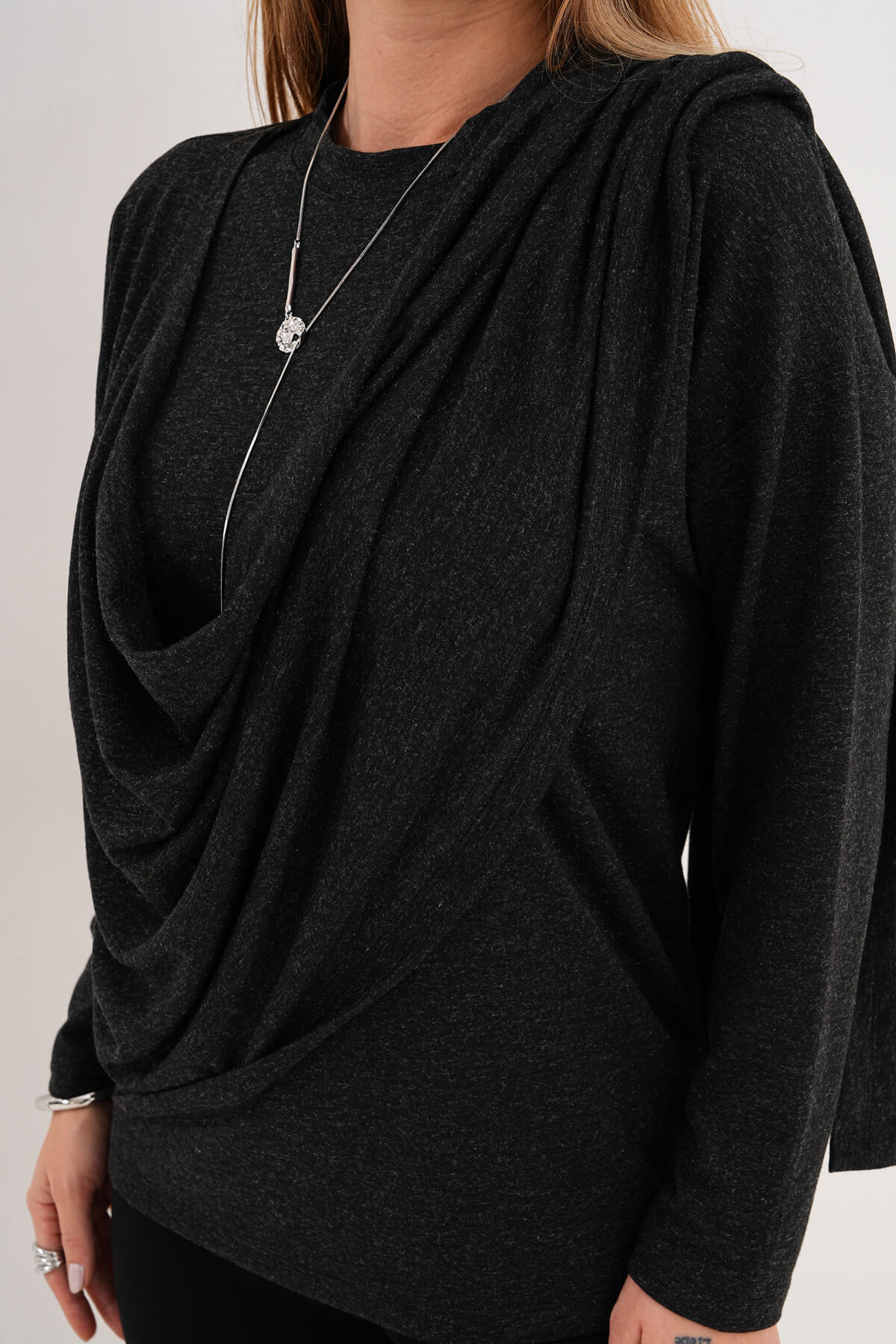 Tek omuzdan şal detaylı bluz. Akıcı dokulu kumaş.