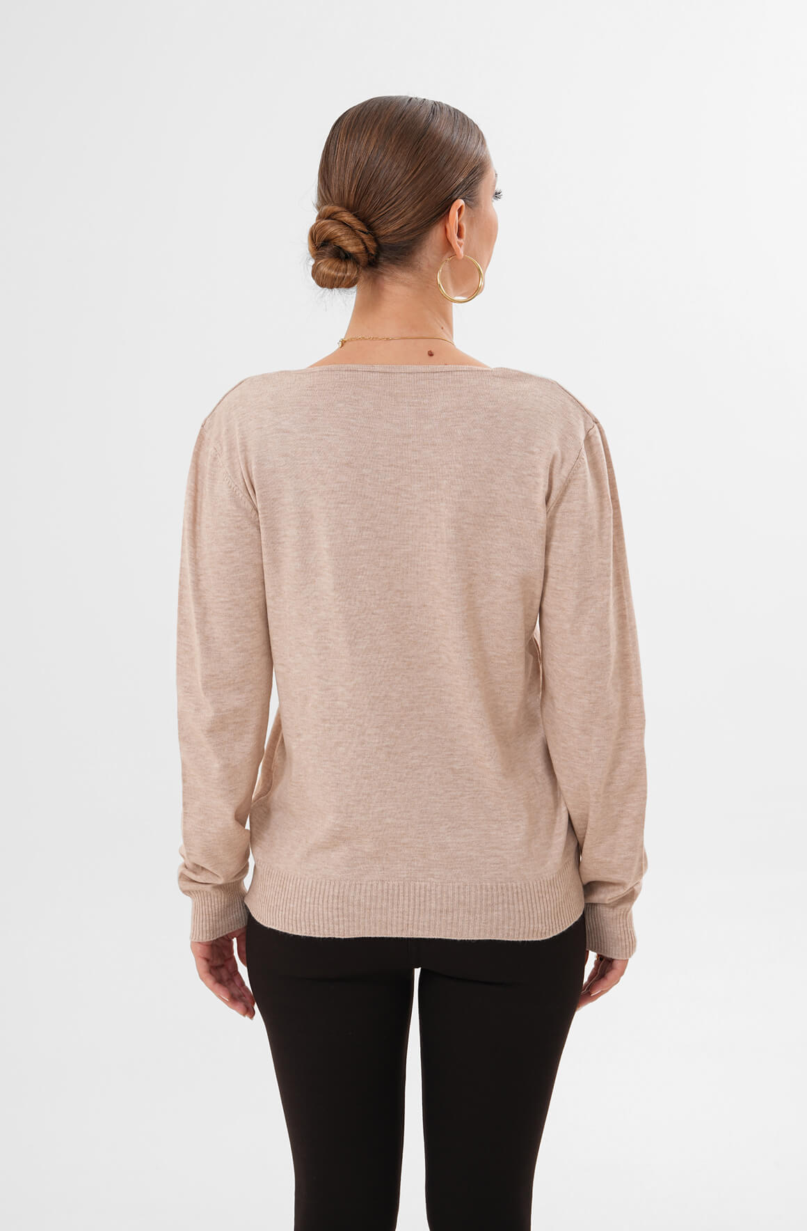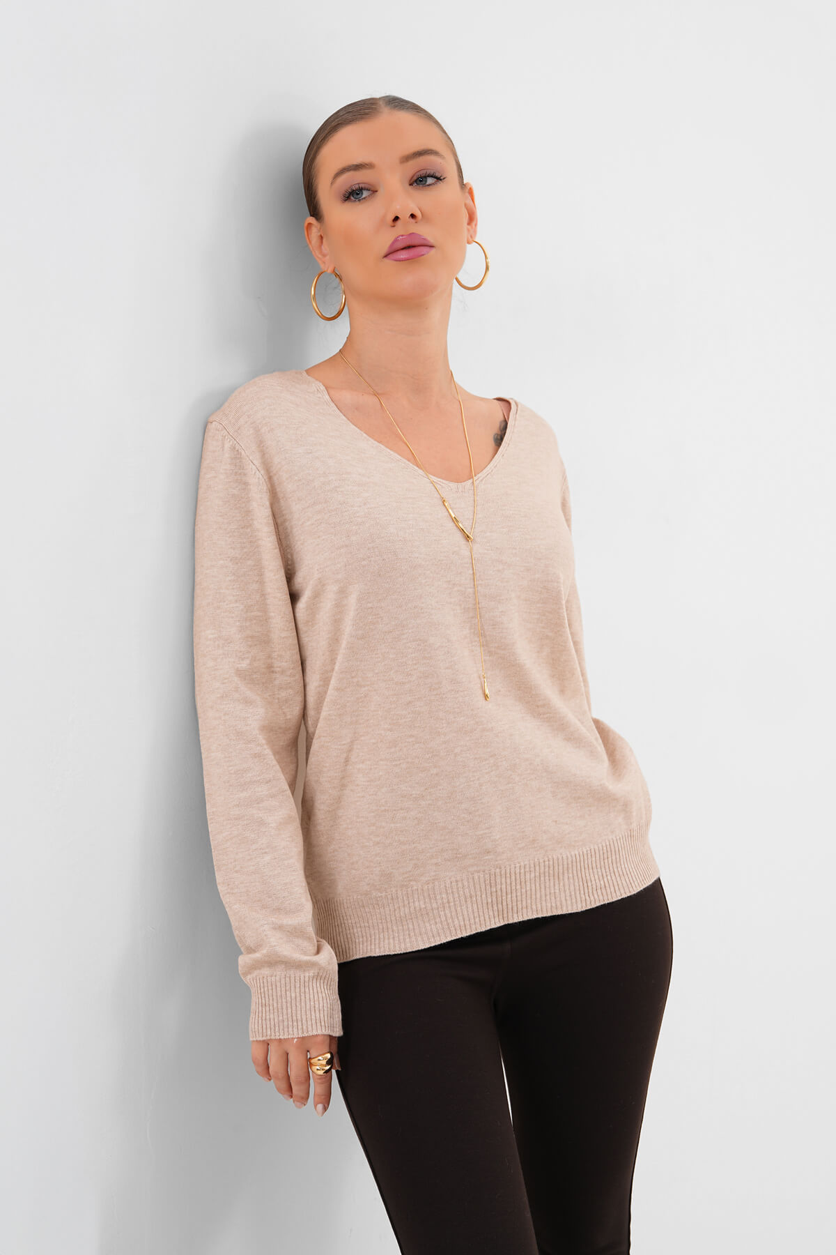 V Yaka Uzun Kollu Triko Kazak MDG-22704 Bej