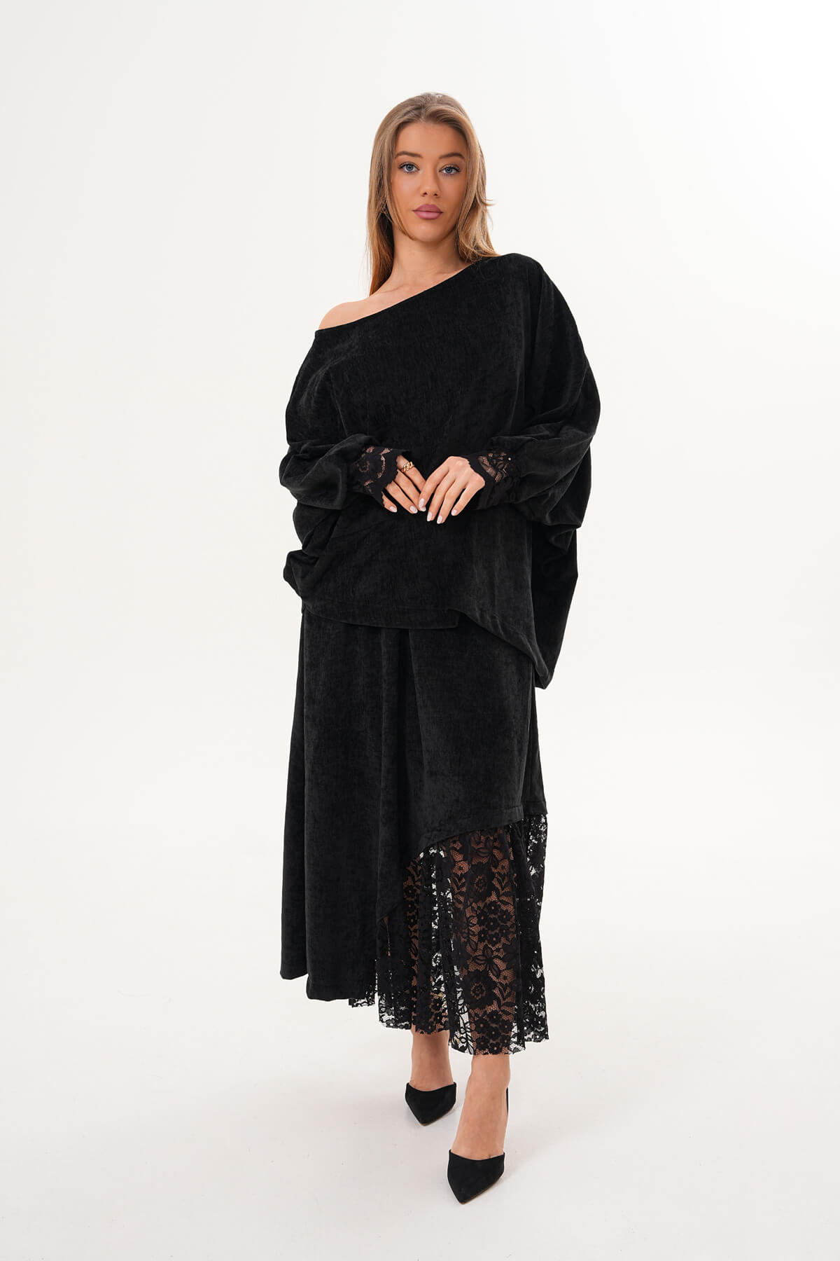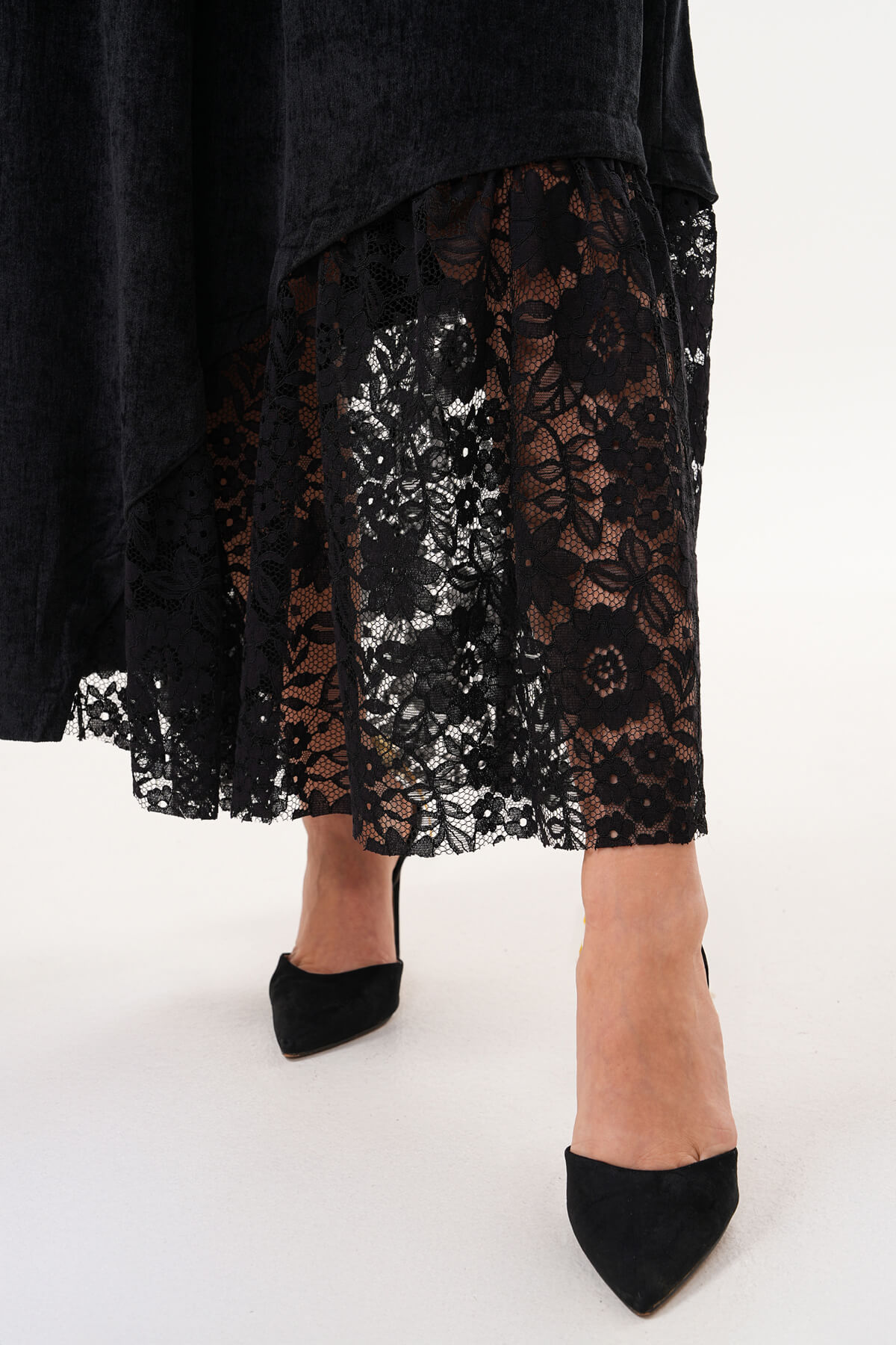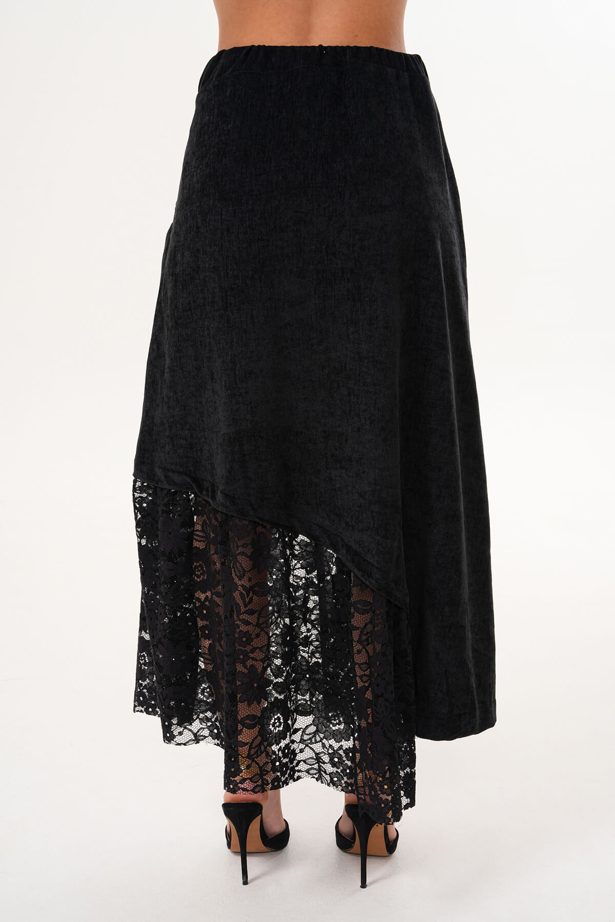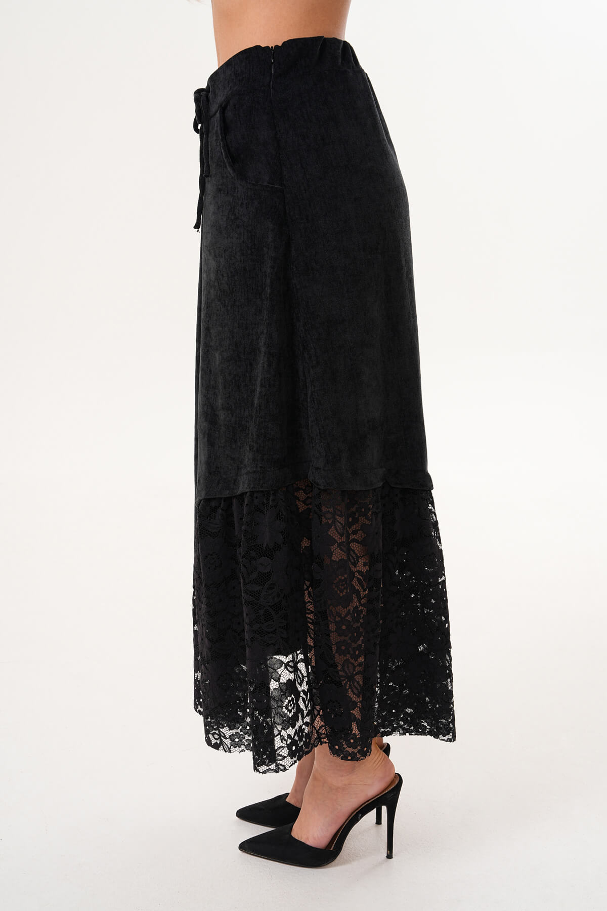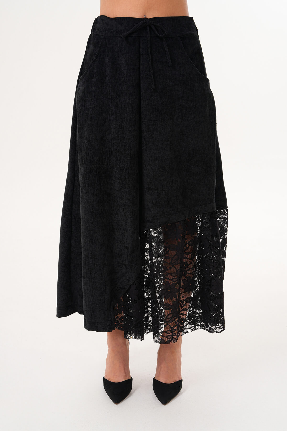 Açıklama: Yüksek bel, yan dikişte gizli fermuar kapamalı kadife etek. Arka bel kısmı lastikli ve ön kordonlu. Ön cepli. Kloş etek ucu ve dantel detaylı tasarım.