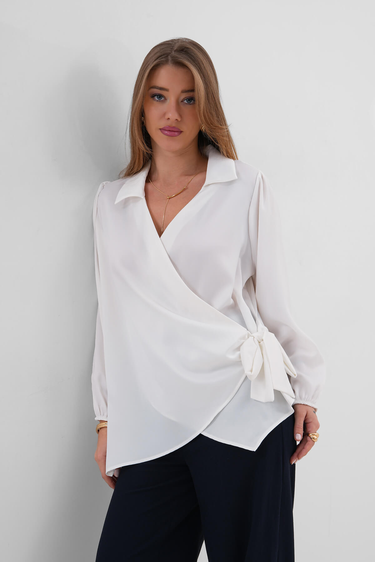 Yandan Bağlamalı Saten Gömlek Ekru