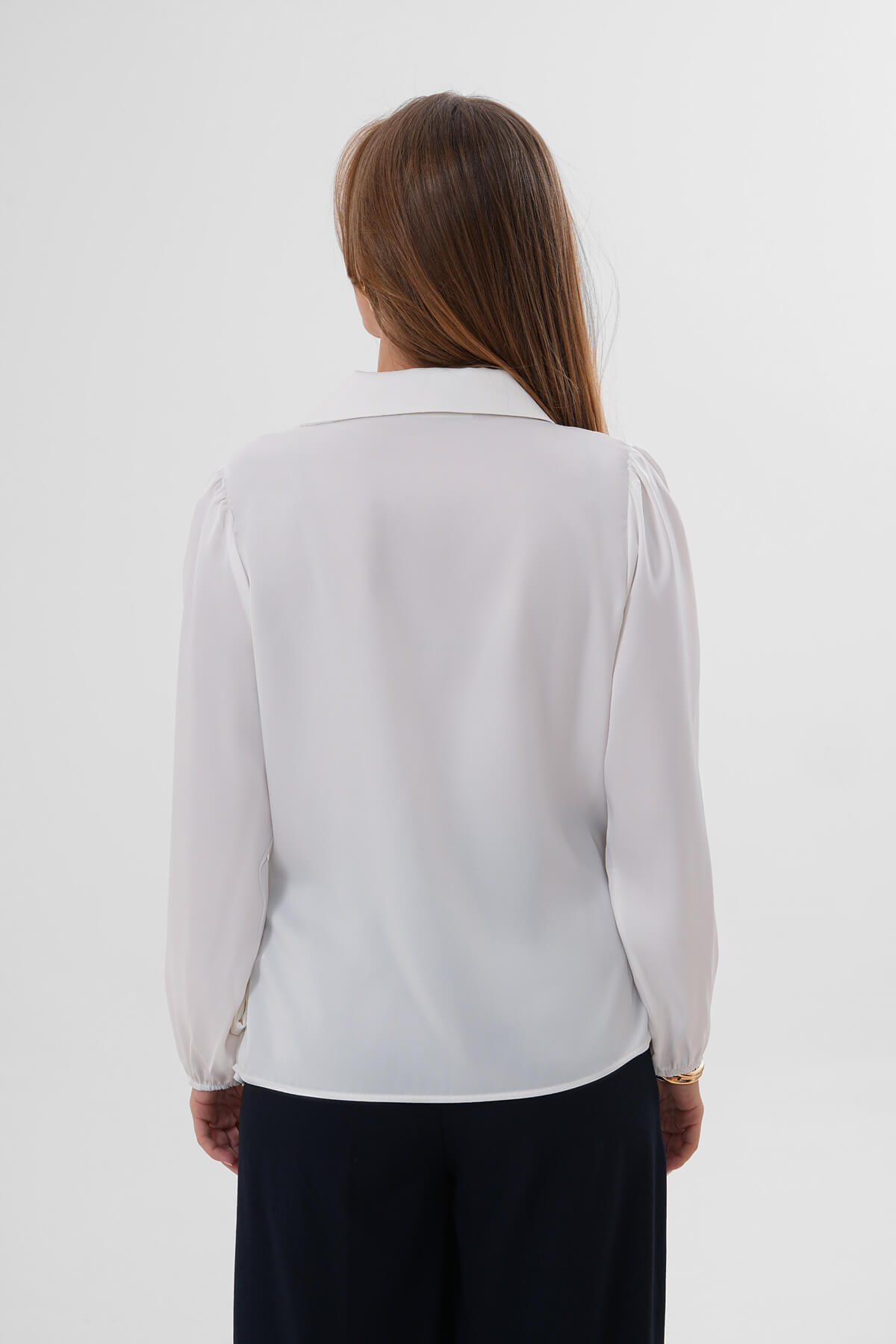 Yakalı formu klasik şıklığı yansıtırken, bağlama detayı gömleği sade çizgiden çıkararak stil sahibi bir görünüm sunar. Uzun kollu tasarımı ve manşetli yapısı ile hem günlük hem de şık kombinlerde rahatlıkla tercih edilebilir.