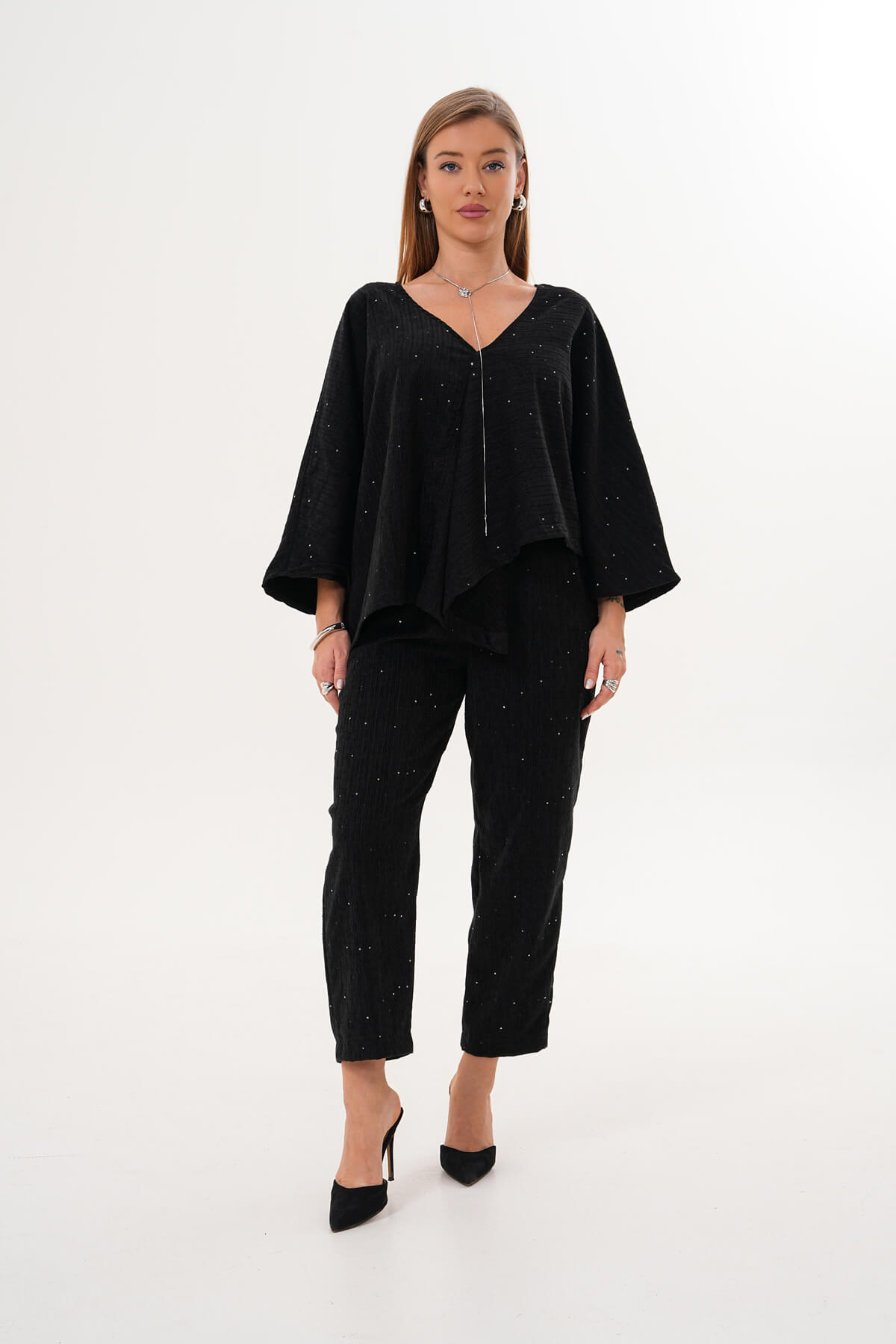 Açıklama: V yaka, ön asimetrik kesimli bluz.3/4 kollu, yarasa kol formunda.