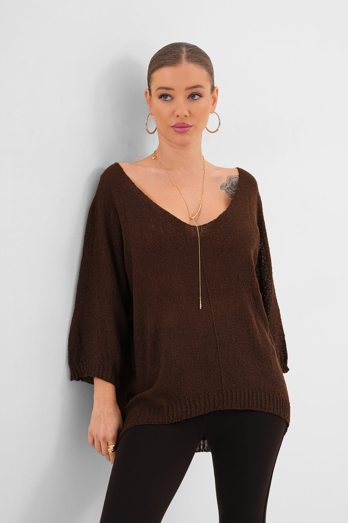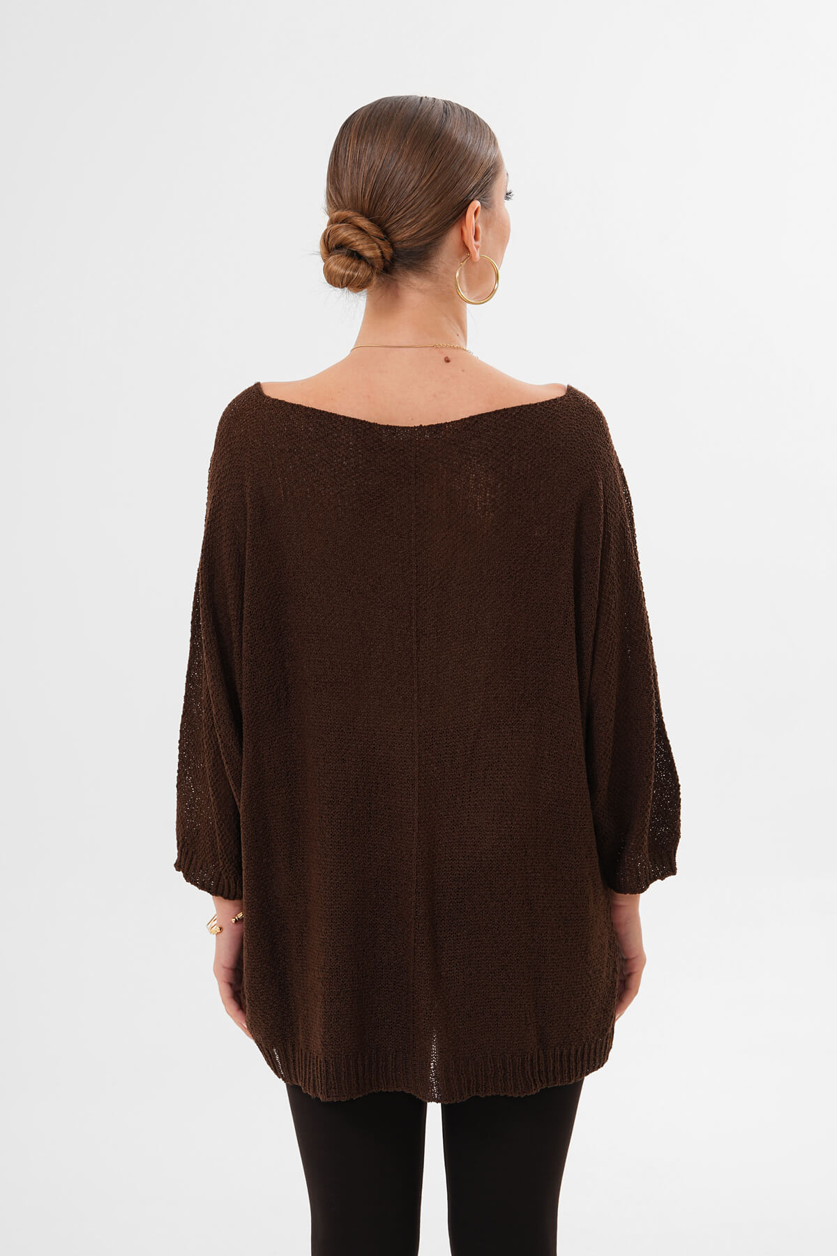 Yuvarlak Yaka Asimetrik İnce Örgü Triko Kahverengi