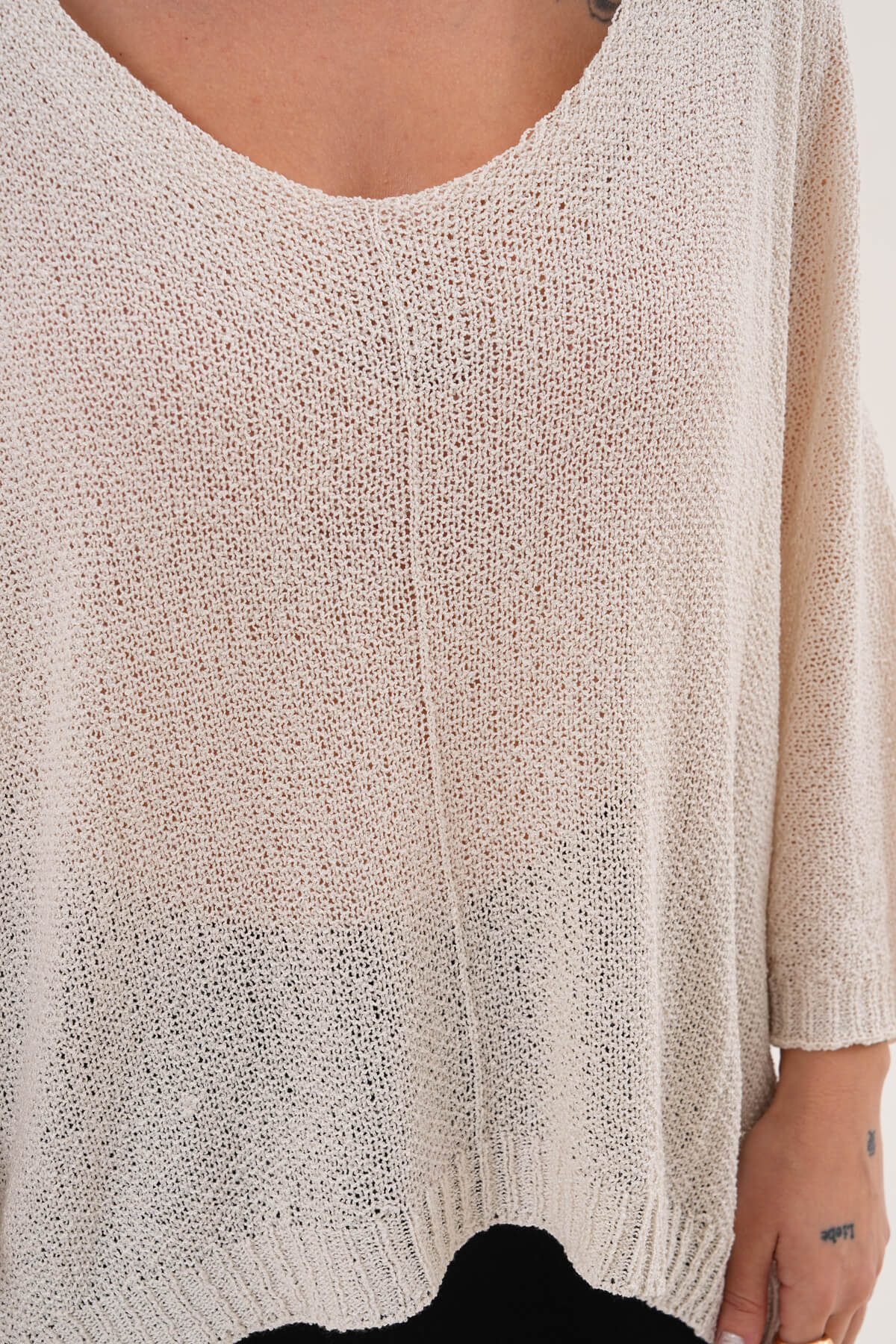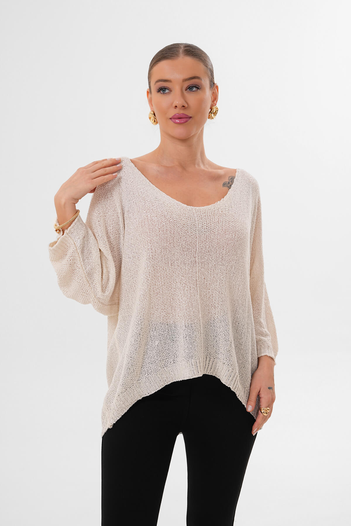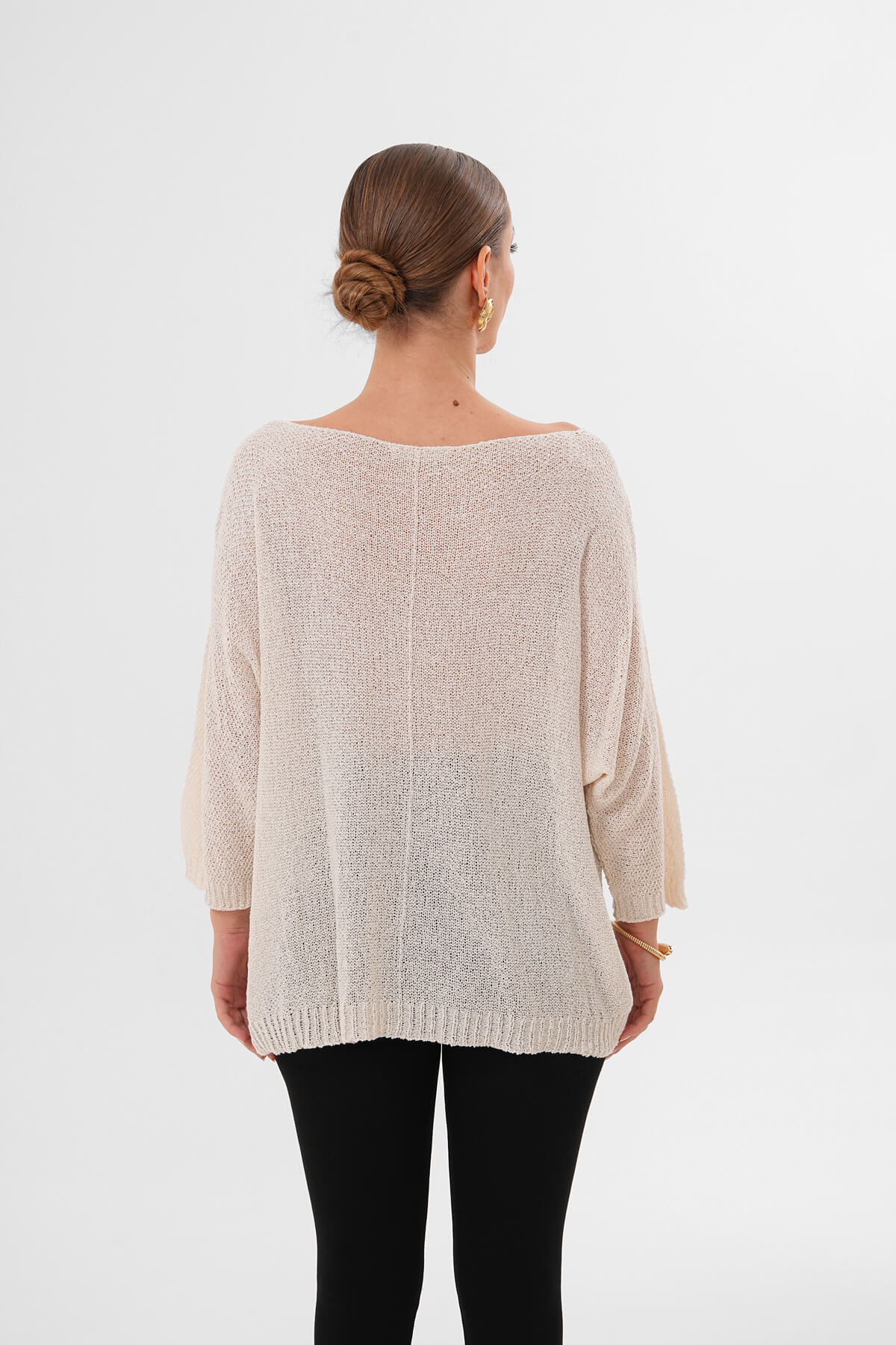 Yuvarlak Yaka Asimetrik İnce Örgü Triko Krem